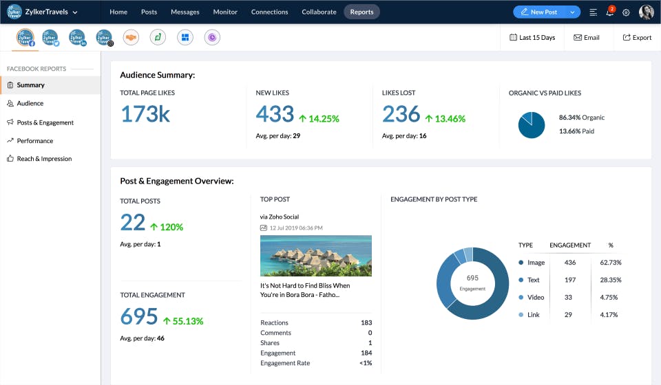 You can use the tool to create a professional social media report that highlights the overall performance of your social media channels, top and recent posts, metrics breakdown, and audience insights.